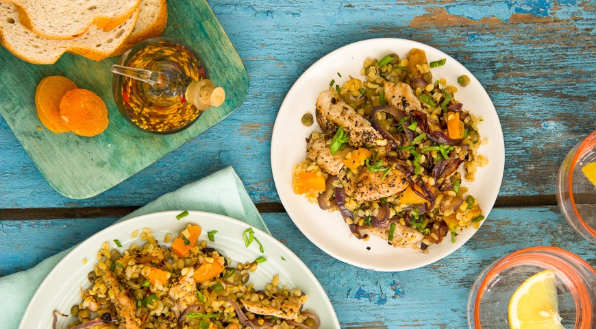 Пряный салат с булгуром, индейкой и курагой