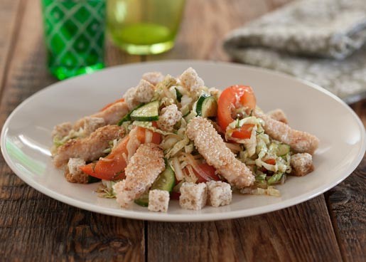 Филе индейки порезать ломтиками толщиной 0,5-0,7 см, обвалять со всех сторон в кунжуте. На сковороде разогреть 1 ст. л. растительного масла и на среднем огне обжарить кусочки индейки по 2-3 минуты с каждой стороны до румяного цвета. Снять с огня, посолить и переложить в салатник. Посыпать сухариками, приправить по вкусу солью, перцем и сразу подать.